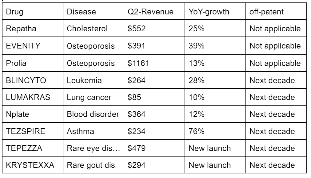The company has 12 drugs in its portfolio growing by double digits. I have listed 10 of them in the table below. Many growers are legacy products derived from recently acquired Horizon Therapeutics, which has bolstered Amgen’s flywheel into oncology and rare diseases.