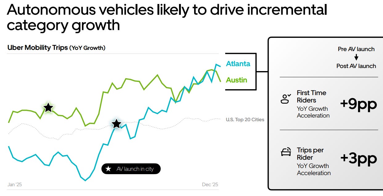 What UBER sees is that overall demand increases wherever robotaxis enters the market. In fact, UBER grows faster in markets with competition from robotaxis than without them (see figure below). Furthermore, in some cities, Waymo is an option on the UBER app.