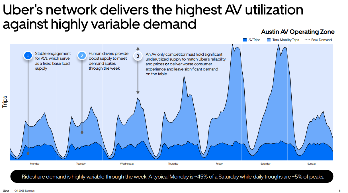 Alas, it is fleet management, not technology, that will decide who wins in the AV ridesharing space. And I assume UBER is the ultimate winner in such a landscape. UBER is already collaborating with the leading fleet managers, and as self-driving tech commoditizes, fleet operators will chase slots on Uber’s app, paying for access to its demand flywheel. Flexible pricing, cross-selling (rides + delivery), and data-driven matching remain Uber’s locked-in advantages in the AV transformation.