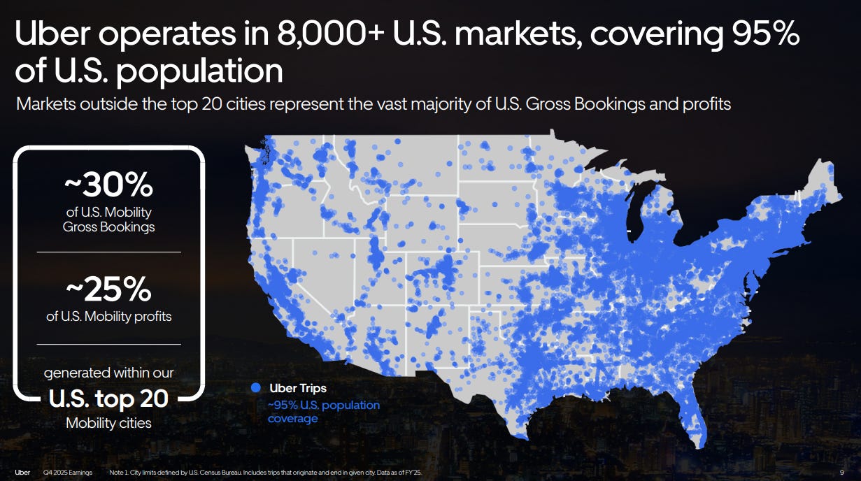 Robotaxi launches in big cities sounds impressive, but most people live in suburbs or smaller towns. The top 20 U.S. metro areas generate just 25% of Uber’s domestic revenue. AVs thus touch only a sliver of the business today (see figure below). In a similar vein, we must remember that 60% of UBER’s revenue comes from outside the US.